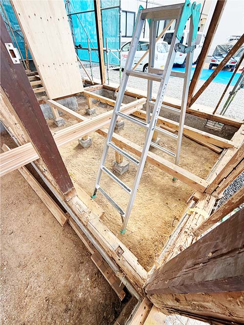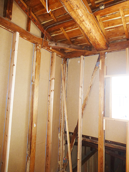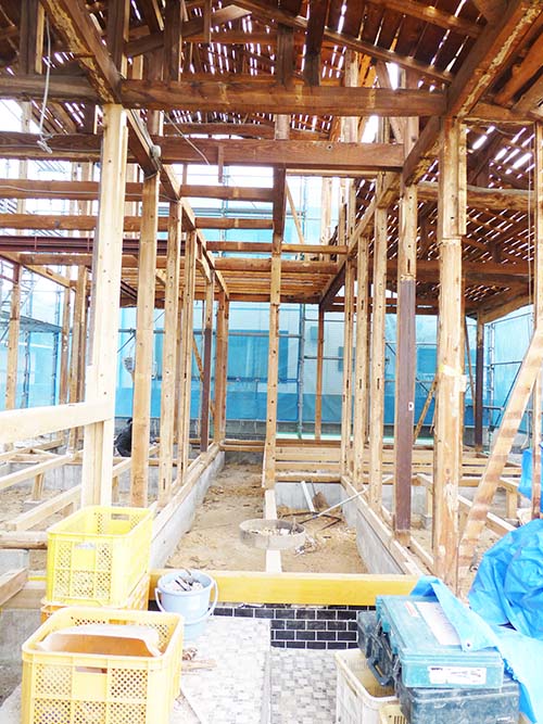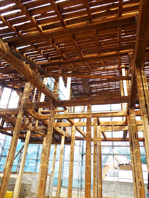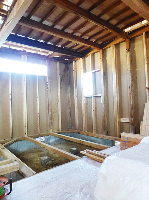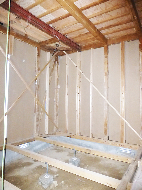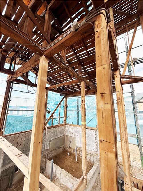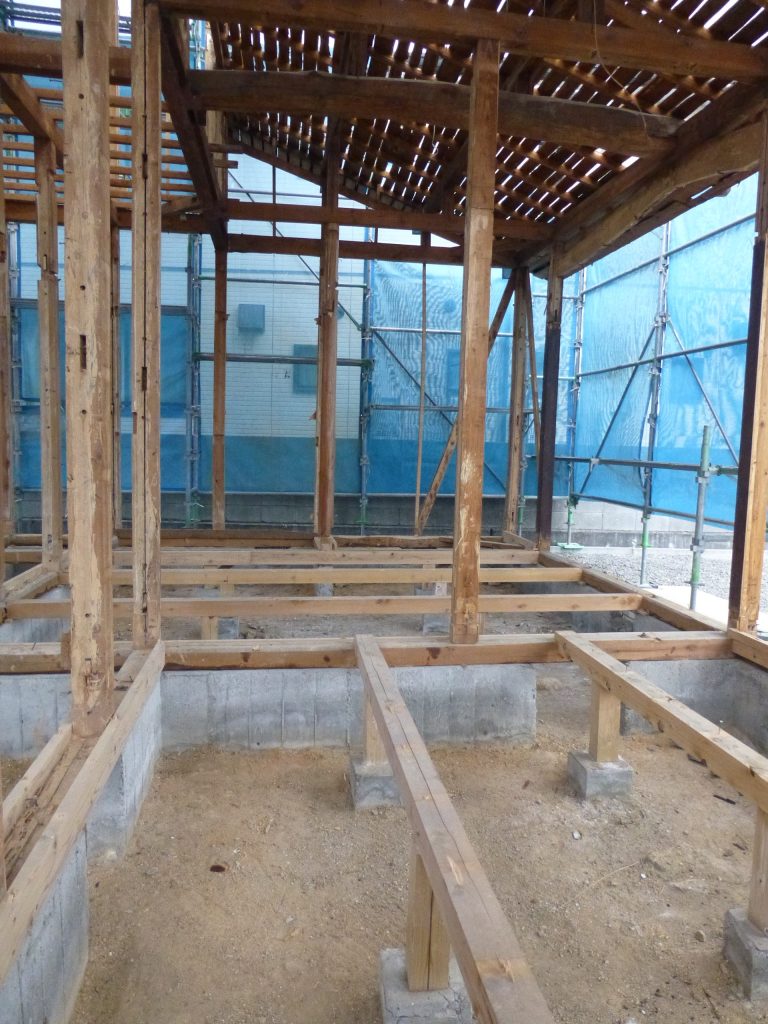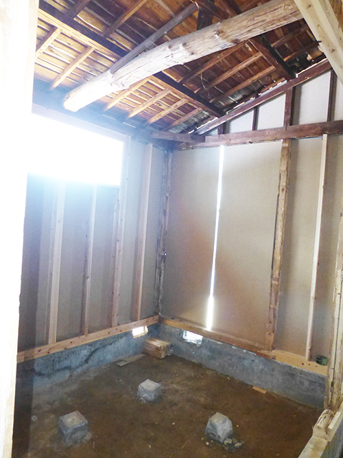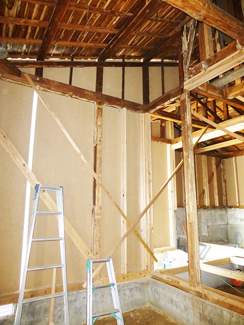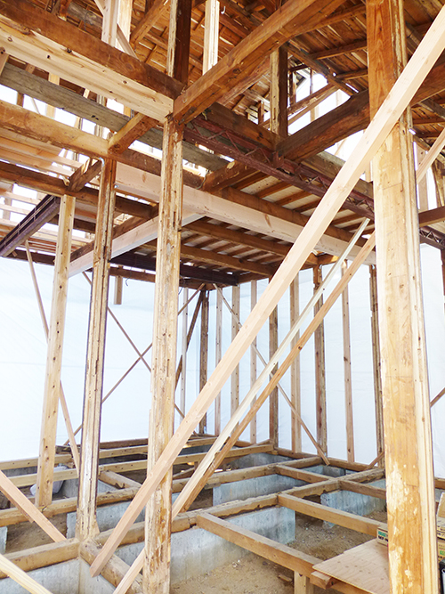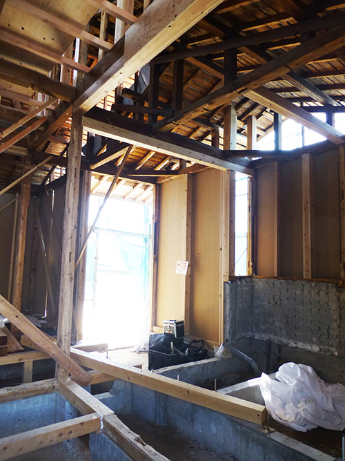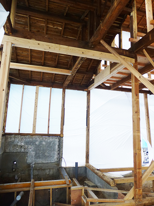 屋根の防水処理が終わり、傷んでいる柱の交換や補修、玄関や水廻りの基礎工事が並行して進められていました。