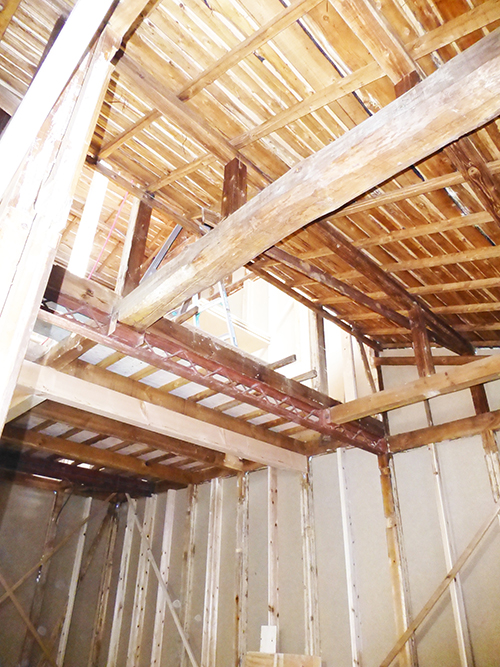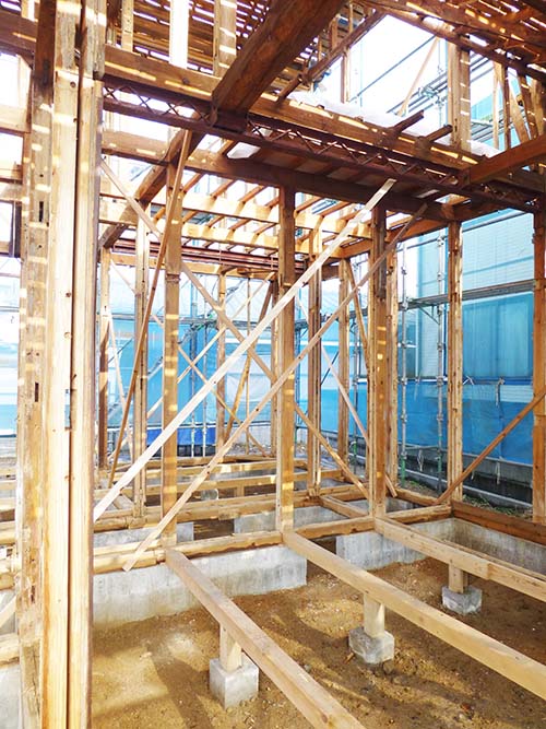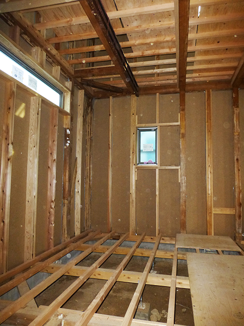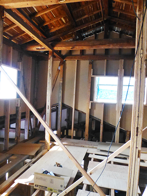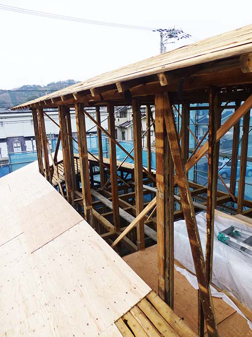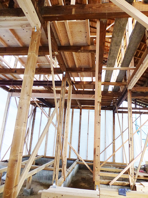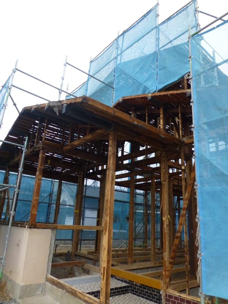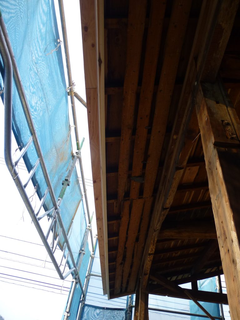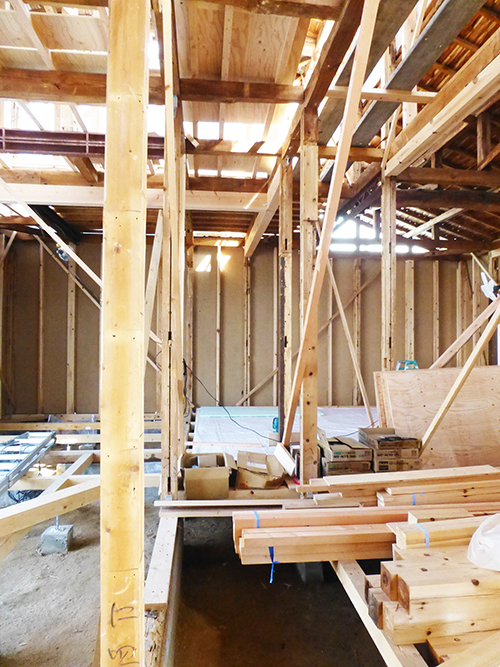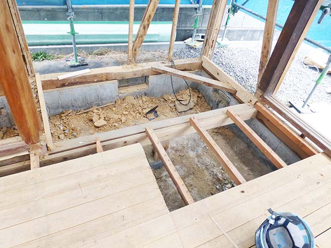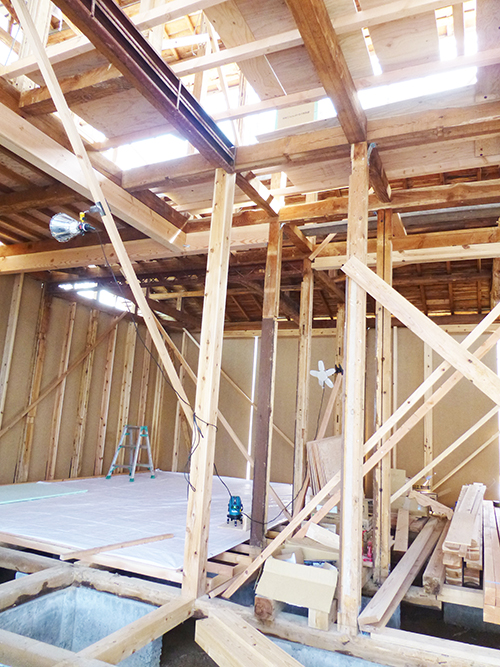 屋根の防水処理が終わり、傷んでいる柱の交換や補修、玄関や水廻りの基礎工事が並行して進められていました。
