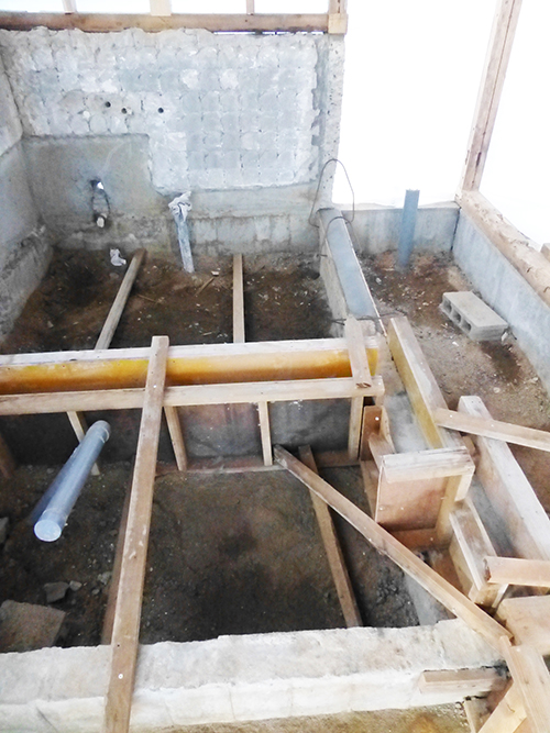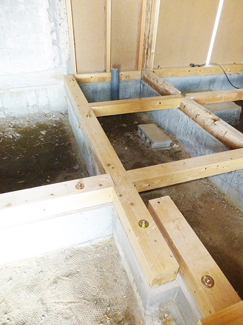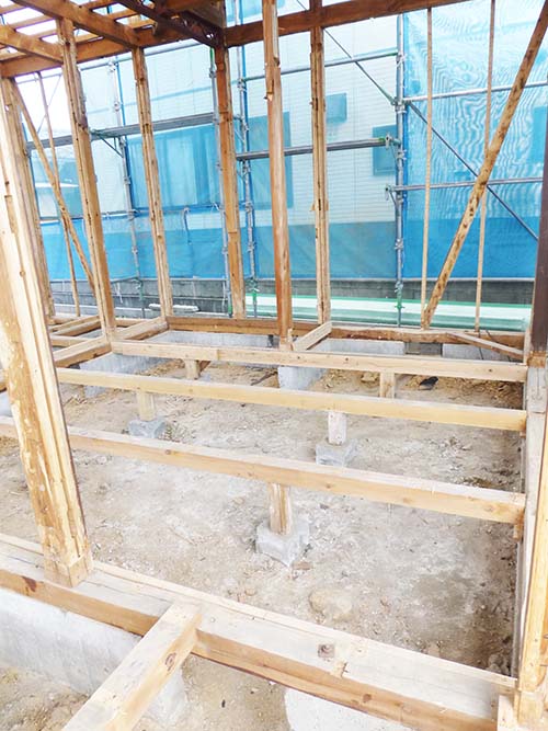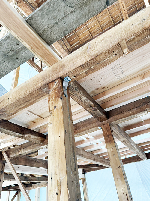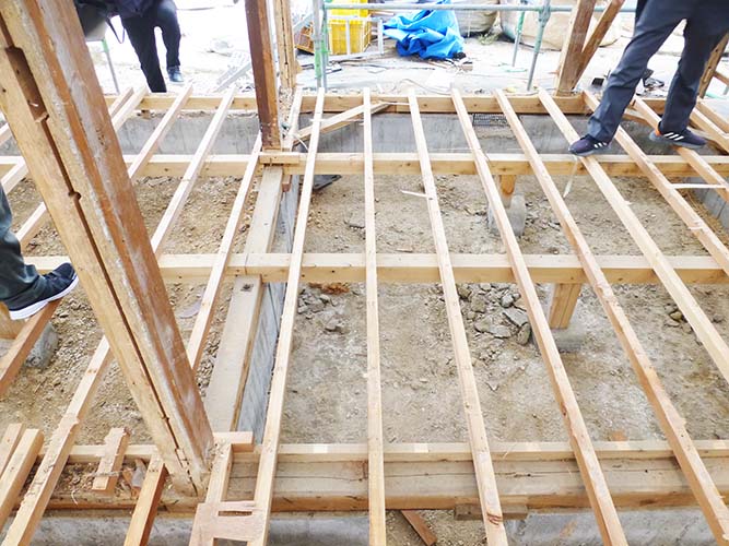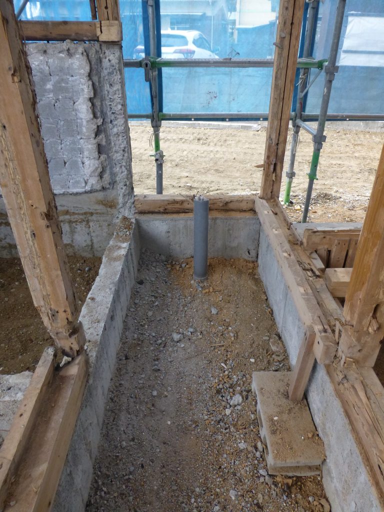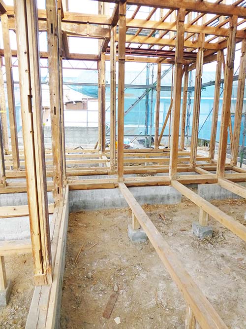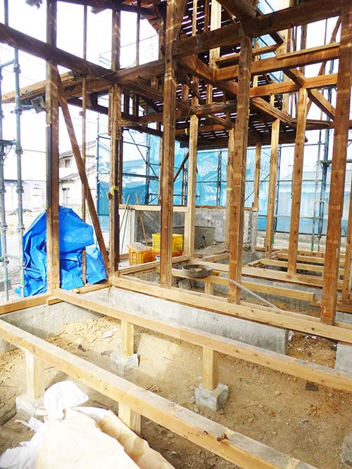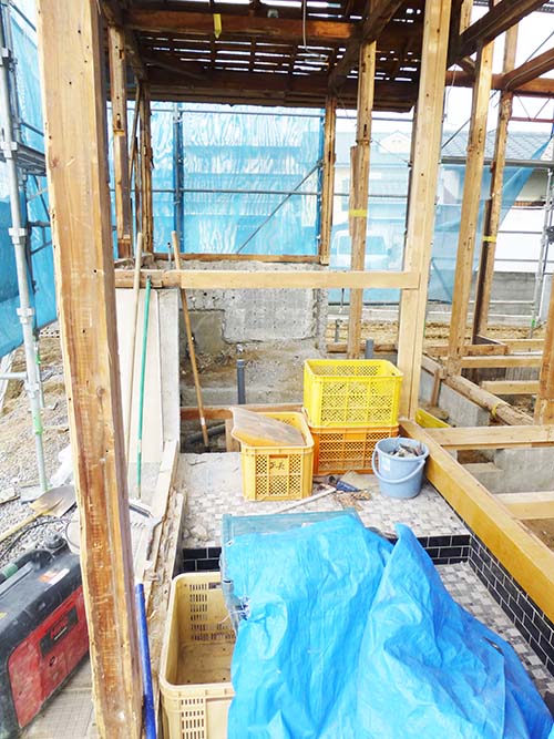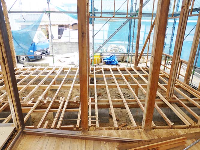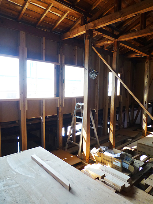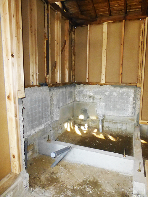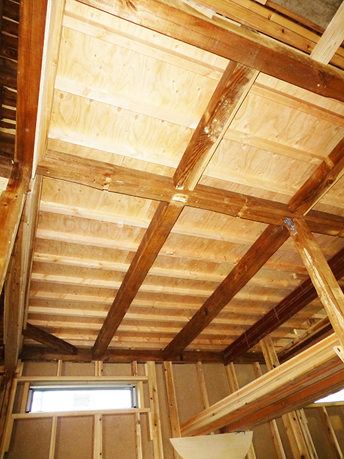 屋根の防水処理が終わり、傷んでいる柱の交換や補修、玄関や水廻りの基礎工事が並行して進められていました。