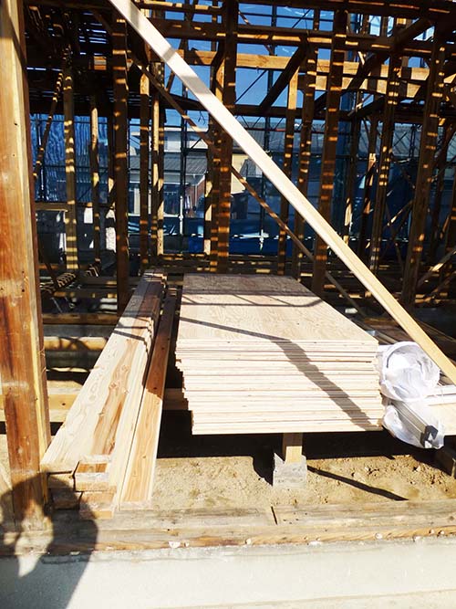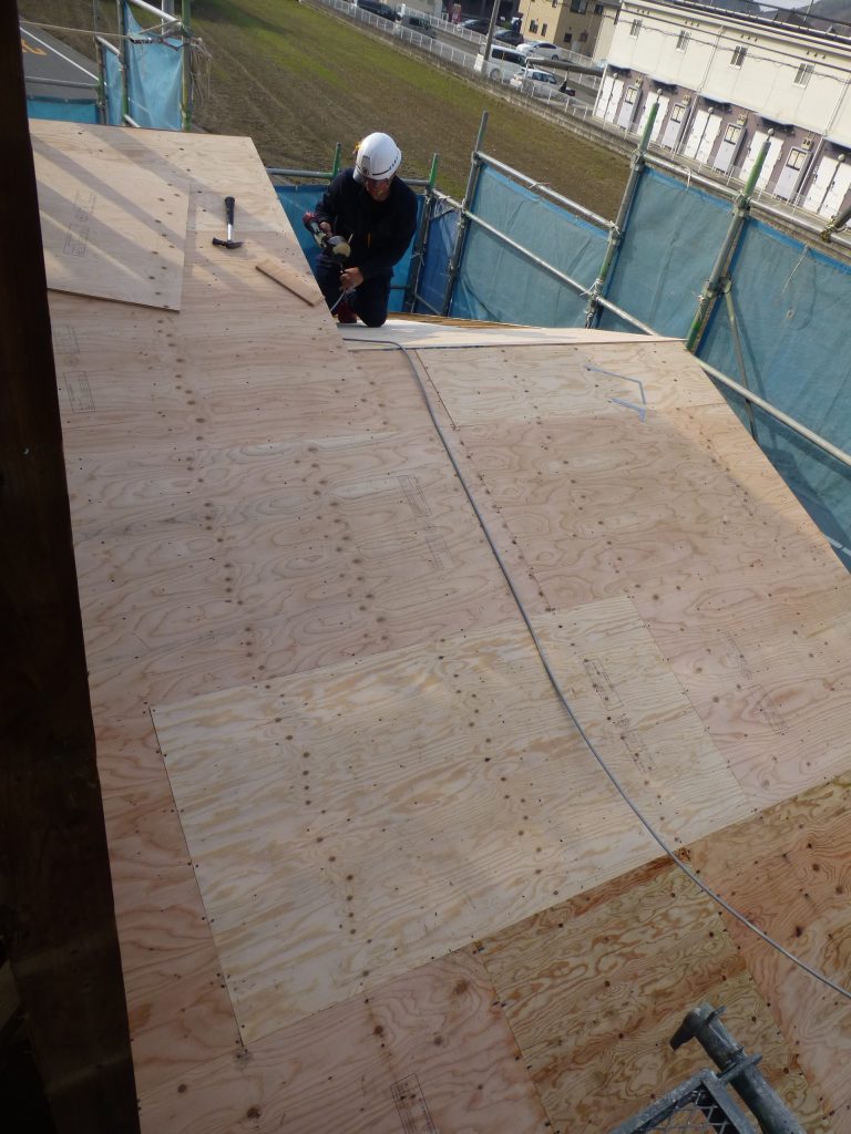 本日は、屋根の上に野地板を乗せる作業をするようです。