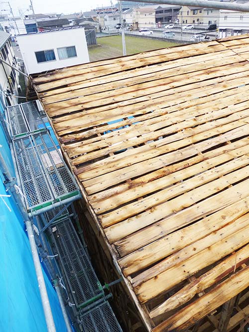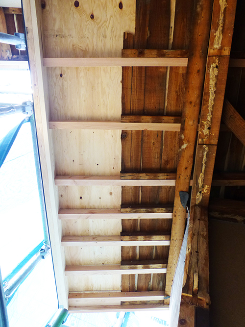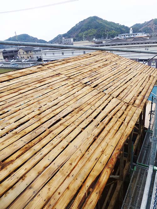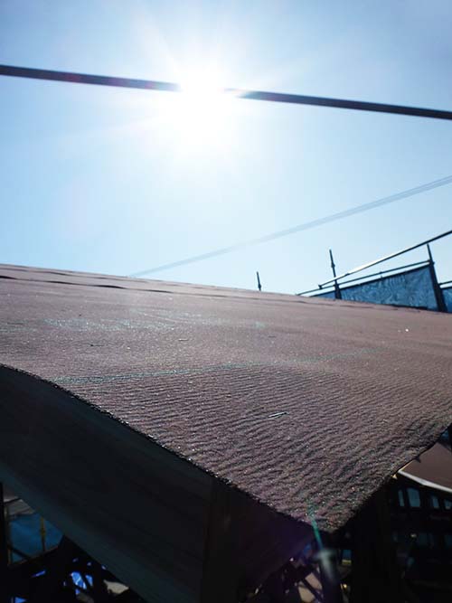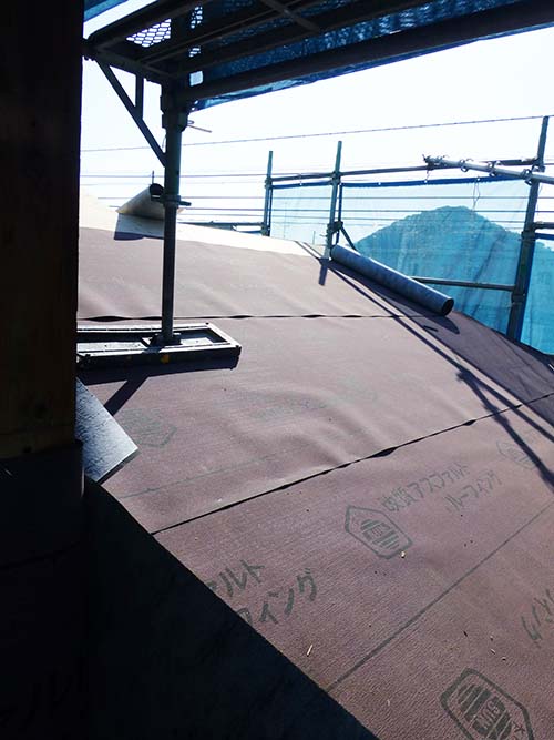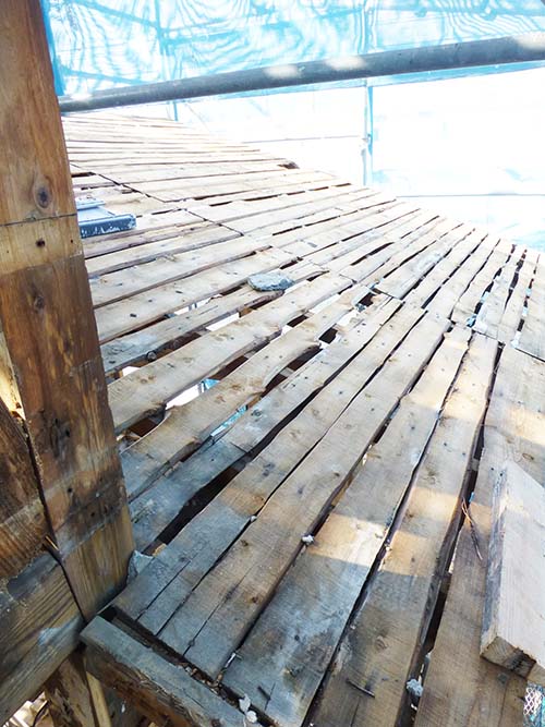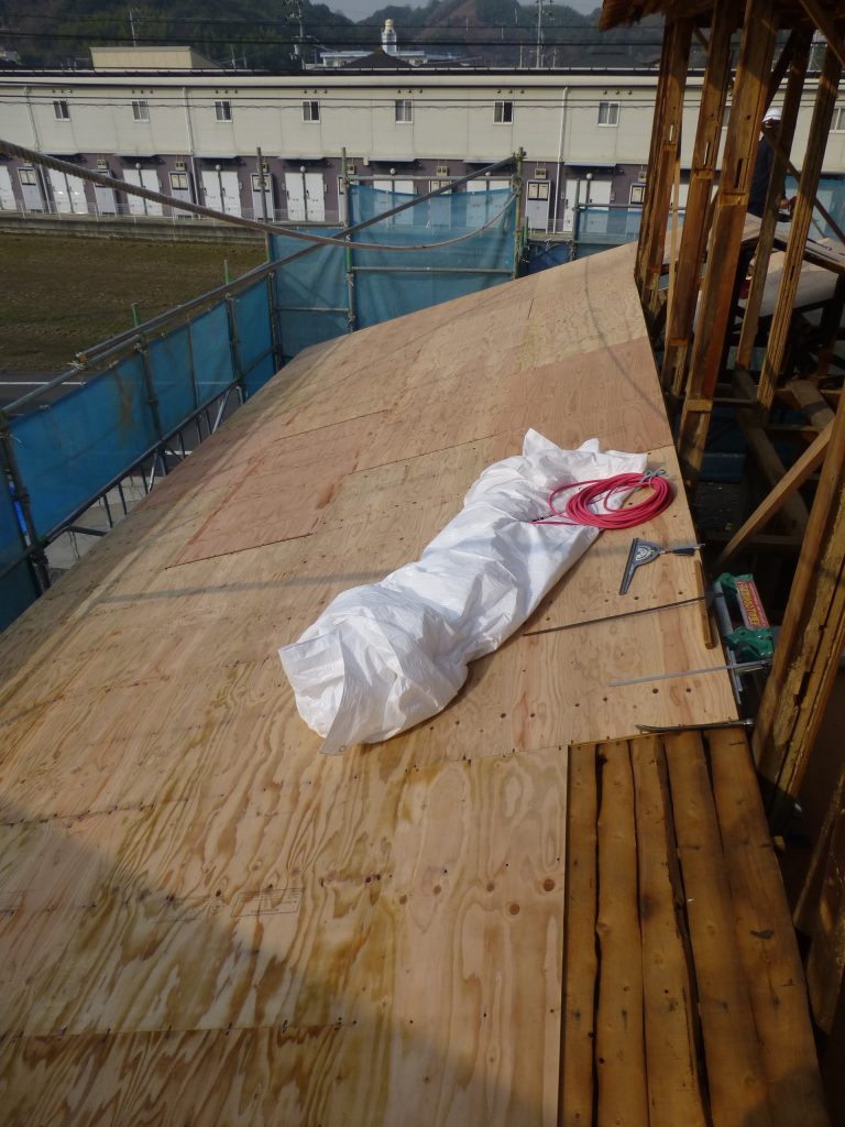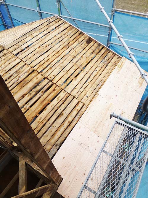 今週中は、天気が良いうちに屋根の補修を進めよう! という事で、屋根の野地板張りと防水シートを設置する工事が進んでいます。