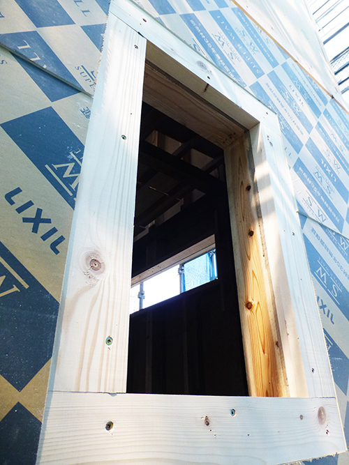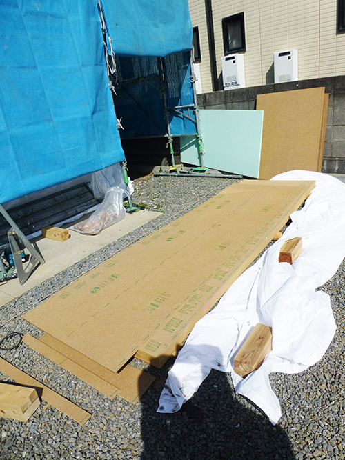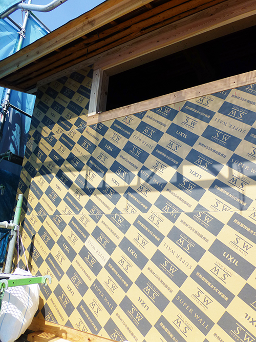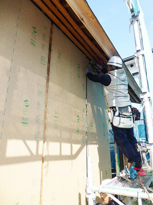 現在、「ハイベストウッド」という壁の下地材の取り付けが着々と進んでいます。大工さんが1枚1枚サイズに合わせてその場で加工し、貼り付けを行っていました!
