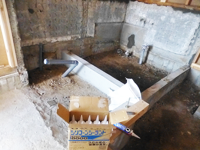 今日は、職人さんが水廻りの基礎の修繕作業と、壁のスキマを埋める「コーキング」作業を進めていました!
