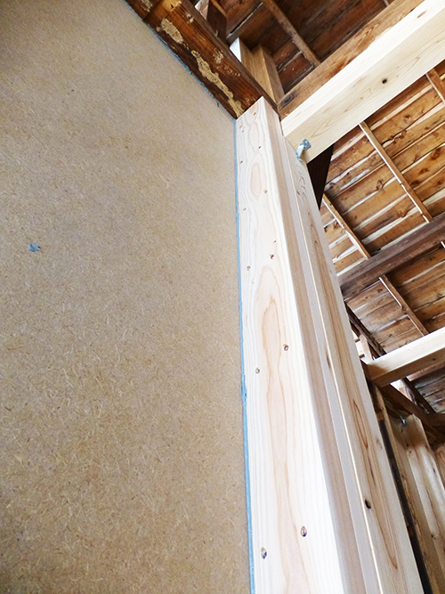 コーキングは、新築の場合は板材に直接コーキング材を塗ってから張り付けるそうなのですが、今回のような古い住宅のリフォームの場合は柱や梁に経年のゆがみが出ている場合が多いので、板材をまず張り付けてから柱と板材のスキマをコーキング材で埋めていく作業になることが多いそうです。