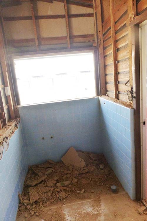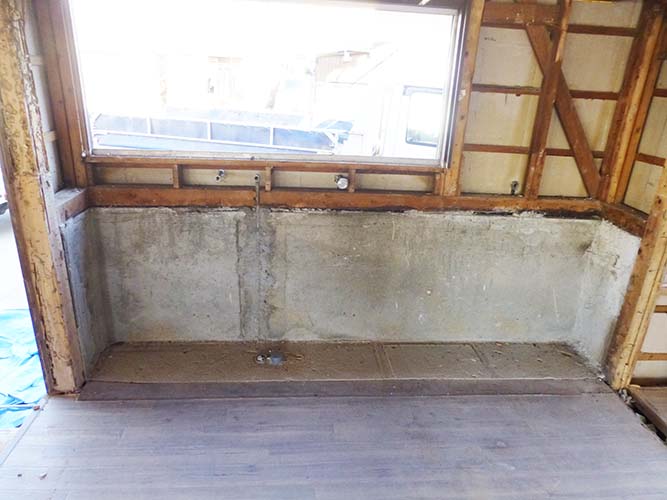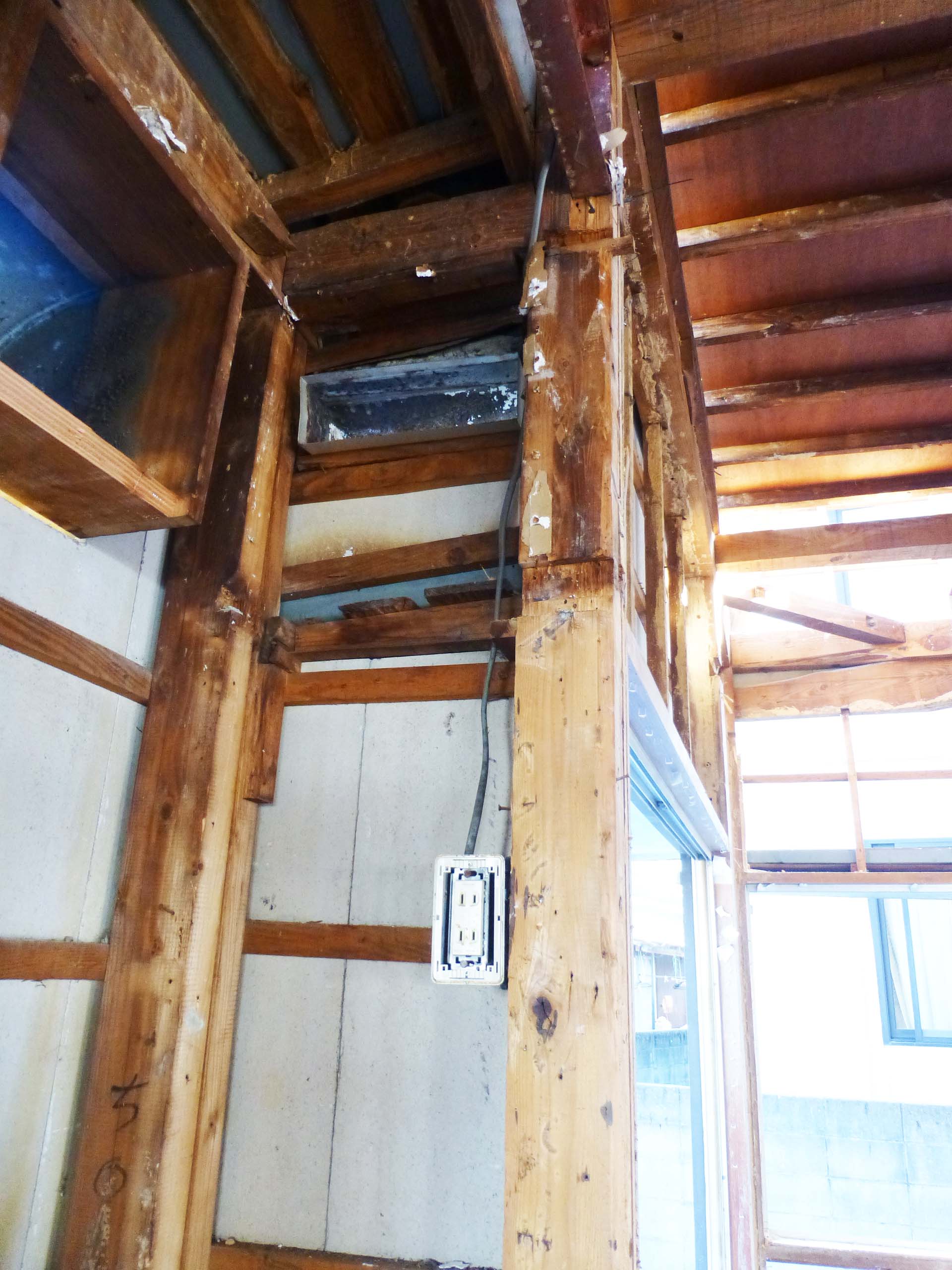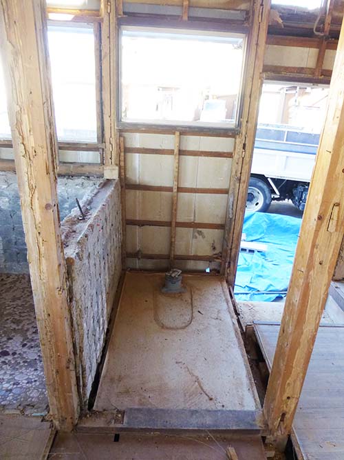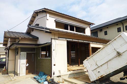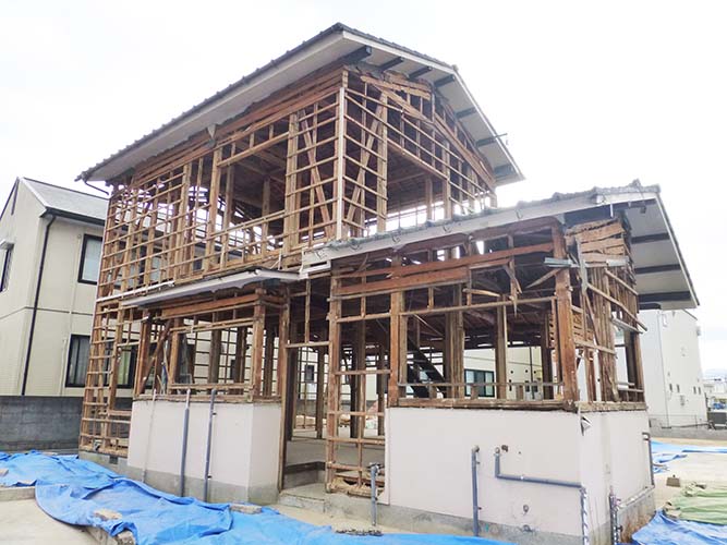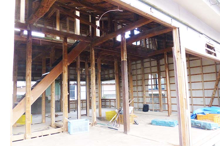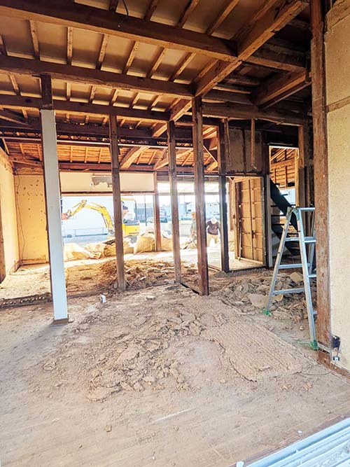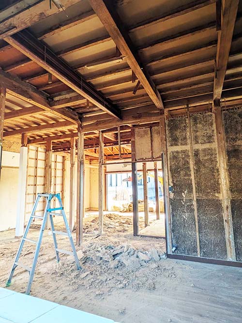 工事が始まりました! 水回りなどの住宅設備を撤去し、既存の壁も取り壊して、構造部分のみの「スケルトン構造」状態まで解体していきます。