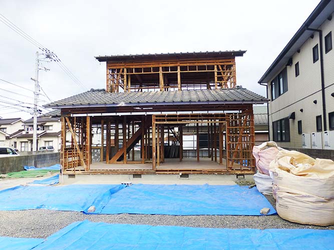 本日は土曜日で、現場に行ってみると業者さんはお休みでいらっしゃいませんでしたが、道具や廃材などもすべて綺麗に片づけられていて、おうちも屋根と床を残して、すべて柱のみとなっていました!